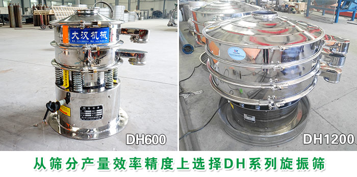 DH系列旋振篩型號齊全產(chǎn)量大,型號分為直徑400mm型、600mm型、800mm型、1000mm型、1200mm型、1500mm型、1800mm型、2000mm型等八種標(biāo)準(zhǔn)機型。篩分分級橡膠粉處理量可達400kg-2T/h,可將物料沿著篩網(wǎng)篩面充分篩分,過網(wǎng)率高篩分精度可達95%。