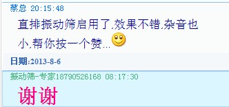 您好,得知您購買我們的ZPS-800型直排篩現已投入到生產中,并且效果很好,雜音也很小,為此向你祝賀。我們大漢公司生產的一系列振動篩,振動振動篩,直排篩,試驗篩,拍擊篩,氣流篩因做工扎實,質量可靠而受到廣大客戶的稱贊。