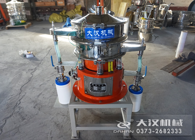 氣體保護(hù)篩分機(jī)是直徑600mm型號(hào),一層兩個(gè)出料口,再原有圓形篩分機(jī)的基礎(chǔ)上加裝氣體保護(hù)裝置,與物料接觸部分是304材質(zhì),采用立式振動(dòng)電機(jī)作為激振源,電機(jī)上、下兩端安裝有偏心重錘,將電機(jī)的旋轉(zhuǎn)運(yùn)動(dòng)轉(zhuǎn)變?yōu)樗健⒋怪?、傾斜的三次元運(yùn)動(dòng),再把這個(gè)運(yùn)動(dòng)傳遞給篩面。