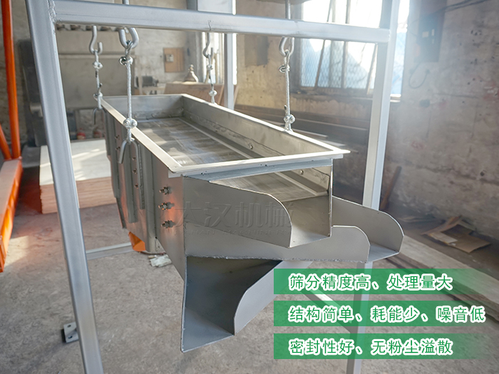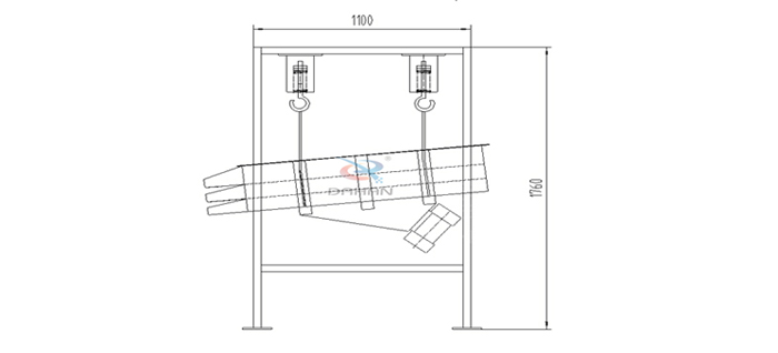 整個設(shè)備由篩箱、網(wǎng)架、篩網(wǎng)、2臺臥式振動篩電機(jī)、減震彈簧、進(jìn)出料口、上蓋組成,除此之外還有高度可按需求定制的支架通過四個吊鉤把整個設(shè)備吊掛起來使其處于懸空狀態(tài)。